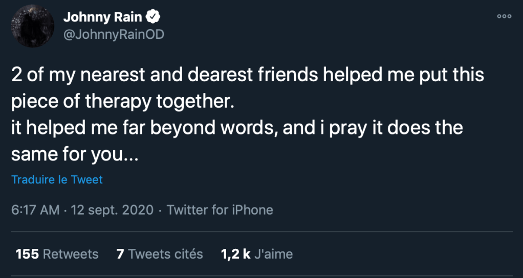 Selon toute vraisemblance, Rain précise, si besoin était, qu’il fait de la musique avant tout pour lui. L’acte créatif est égoïste par essence, il est dénué de toute perspective autre que celle du créateur. Il est cathartique. Il est thérapeutique. Il est résurrection en un sens. De fait, au diable la célébrité. Tant que les artistes que nous chérissons pour ce qu’ils ont la magnanimité de nous offrir parviennent à s’affranchir de certains maux qui les affligent dans le processus créatif et ce qu’il en découle, c’est tout ce qui importe. Et si, comme il l’indique, ça peut aider d’autres gens, c’est que la boucle est complètement bouclée et que le cercle est tout à fait vertueux. Longue vie à Rain et à tous les autres.