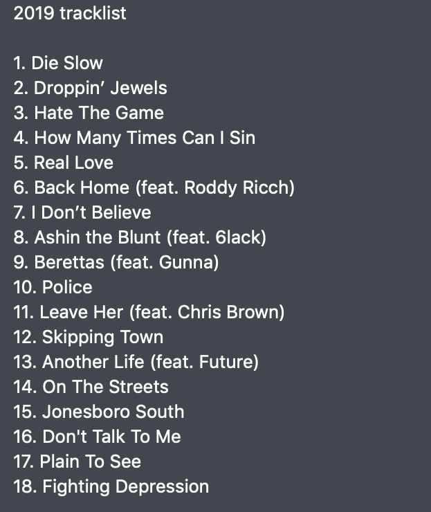 PS: Pour ceux que cela intéresserait, il faut savoir que l’album avait, dès 2019, une tracklist, qui est bien différente de celle qu’on lui connaît aujourd’hui. La voici, à titre de comparaison, pour vos recherches, ou simplement pour votre culture. Ashin’ the Blunt a leaké en début d’année dernière.