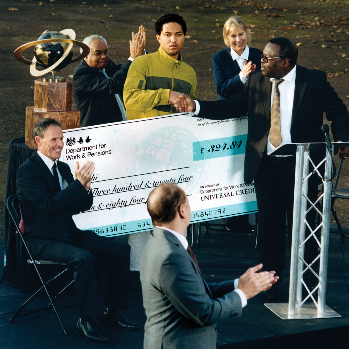 A la manière du revenu de solidarité active (RSA), l’universal credit est l’aide fourni par l’Etat du Royaume-Uni pour soutenir les bas revenus en leur versant une somme d’argent chaque mois. Tout comme en France, cet appui financier donne lieu à des débats quant à la légitimité de ce programme et alimente des idées haineuses divisant la population. Jeshi utilise l’universal credit tel un symbole en nommant son album ainsi, représentation de la misère inhérente, d’un climat nourri par la peur d’autrui appuyé par une politique pro-Brexit plus que douteuse. Alors, la pochette de l’album tourne cela en dérision, un chèque géant cartonné dans les mains de notre protagoniste, des hommes en costard en train d’afficher un large sourire, symbole de la démesure portée envers ces aides sociales, vu telle un loterie gagnante au yeux du gouvernement. Ainsi, cette devanture n’évoque qu’une infime partie des enjeux sociaux du pays, toutefois résumant avec clarté leur globalité sous cette métaphore illustrée.