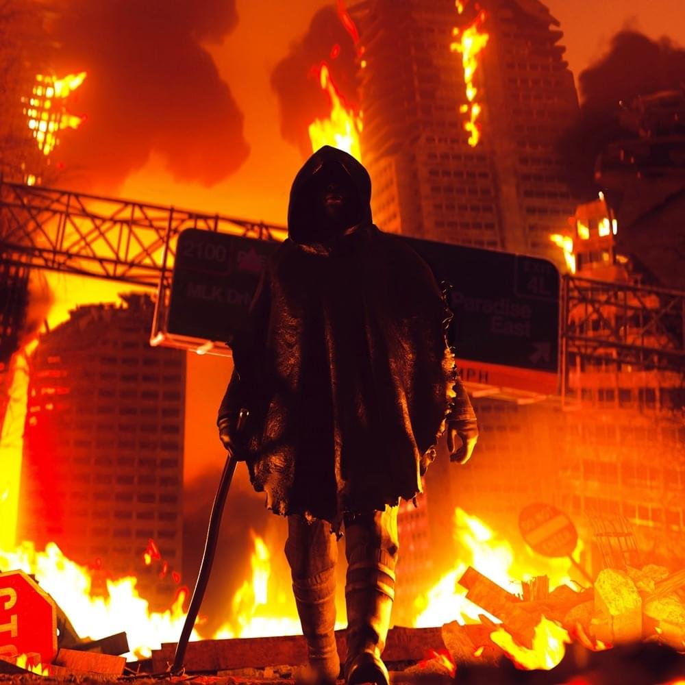 À travers cette nécropole enflammée, une seule silhouette rode à travers les macchabés de chair, de béton et de fer. Capuché et sous une sorte de longue houppelande noire, sa démarche rappelle celle d’un ivrogne maladroit. Dans ses deux mains, deux énormes pistolets encore fumants, plus grands que le Slender Man. On perçoit à peine son visage. Sur ses joues se sont propagées des écailles innombrables pareilles aux cassures d’un vieux parchemin. L’iris de ses yeux rouges, en alerte, perce une brèche dans l’obscurité. À mesure qu’il vagabonde dans les rues méconnaissables, des basses distordues aux allures de musiques martiales retentissent dans l’air frelaté. Par dessus, une voix nasillarde déchire le silence dans des cris plaintifs. Elle semble combattre une deuxième voix faite d’aboiements et de grommellements bestiaux.