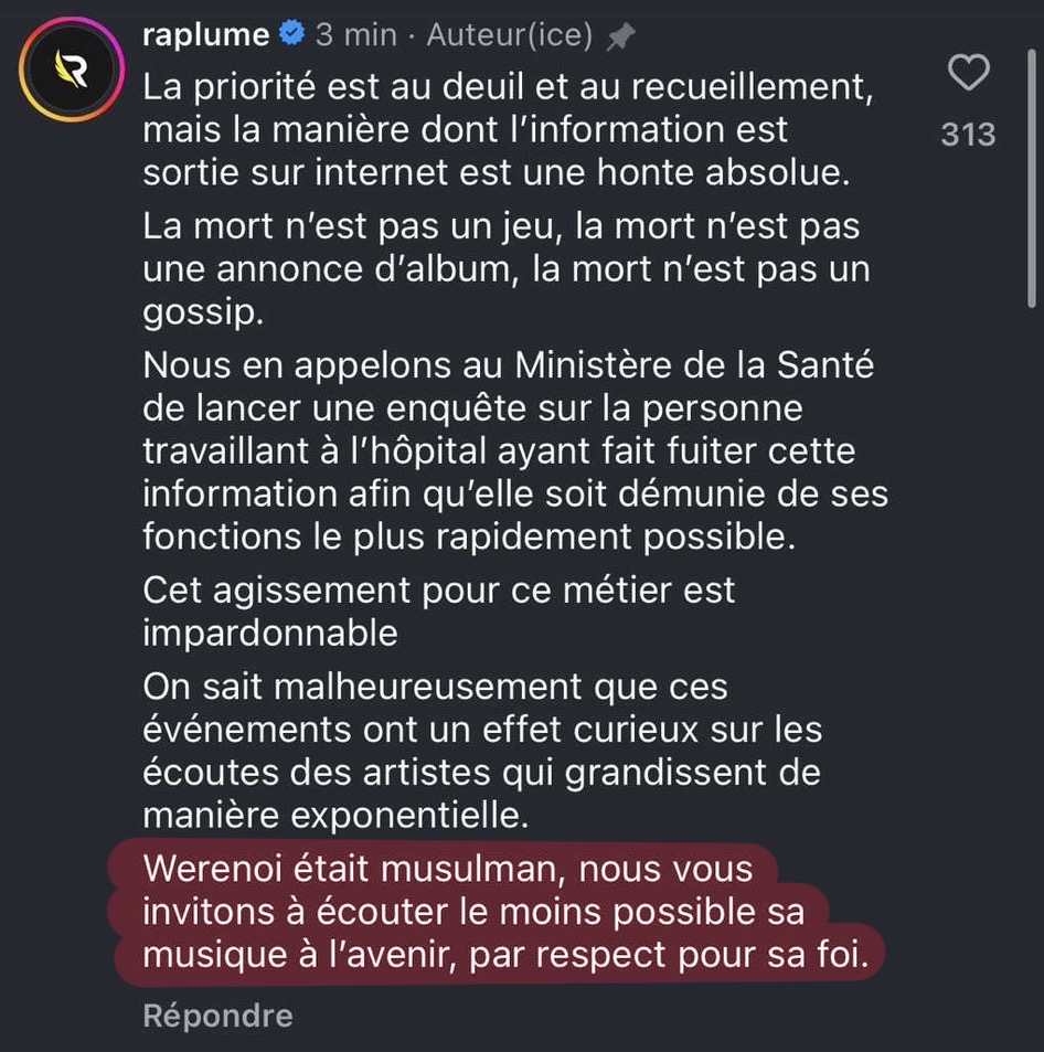 L’affaire prenant une tournure absurde sur X, faisant par la même occasion entrer dans le faux-débat les pires bouffons d’extrême droite, la propre mère de l’artiste a même dû prendre la parole pour annoncer que personne ne l’interdira d’écouter la musique de son fils. Grosse boulette. Doit-on condamner le média pour répandre ces débilités alors que l’on parle du décès de quelqu’un ? À vous de juger. De notre côté, nous ne pouvons que saluer l’énergie que Raplume déploie pour repousser les limites de l’absurdité : qui aurait imaginé qu’un média centré sur la musique, en partie financé par des labels cherchant à promouvoir leurs albums à travers des posts rémunérés, appellerait à l’interdiction de ce qui les fait manger ? À ce niveau-là, il ne s’agit plus que d’applaudir. Bravo les mecs.